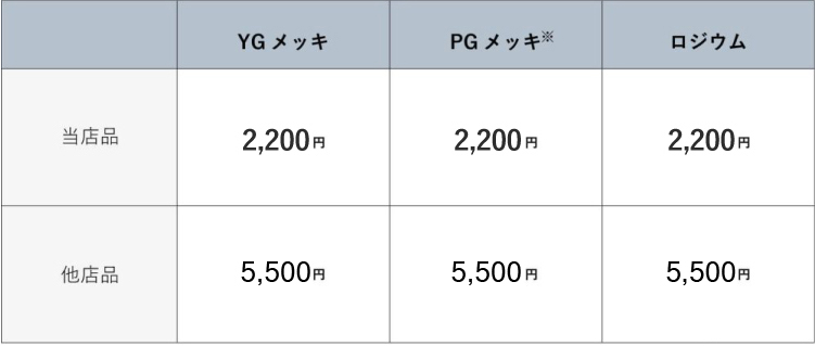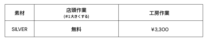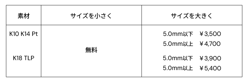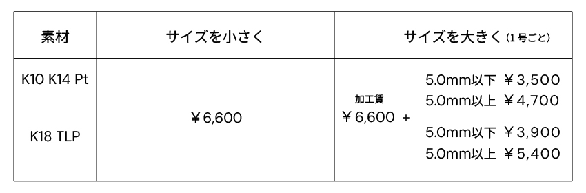 サイズを大きくするなどで、新たに金属を足す必要がある場合に「足した分の金属代」が、1号大きくするごとに発生いたします。