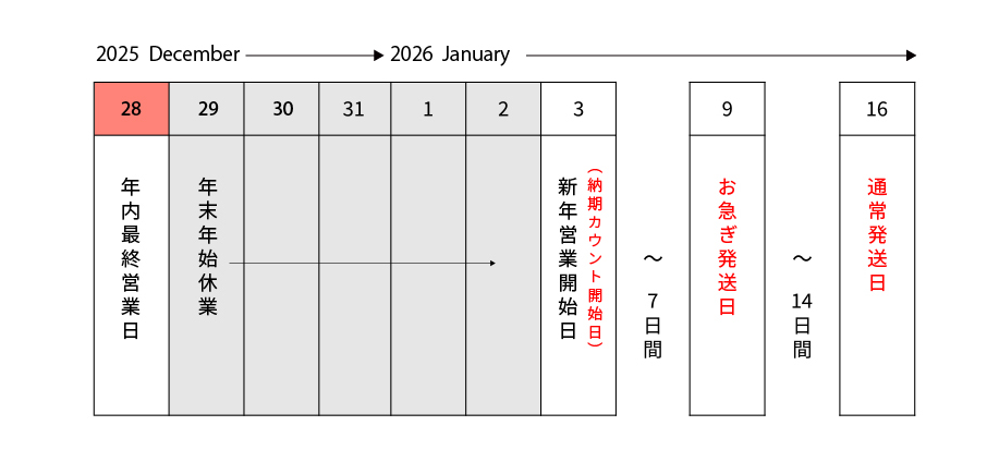年末年始休業中にお申込みいただいたご注文の納期は、1/3よりカウントをさせて制作させていただきます。