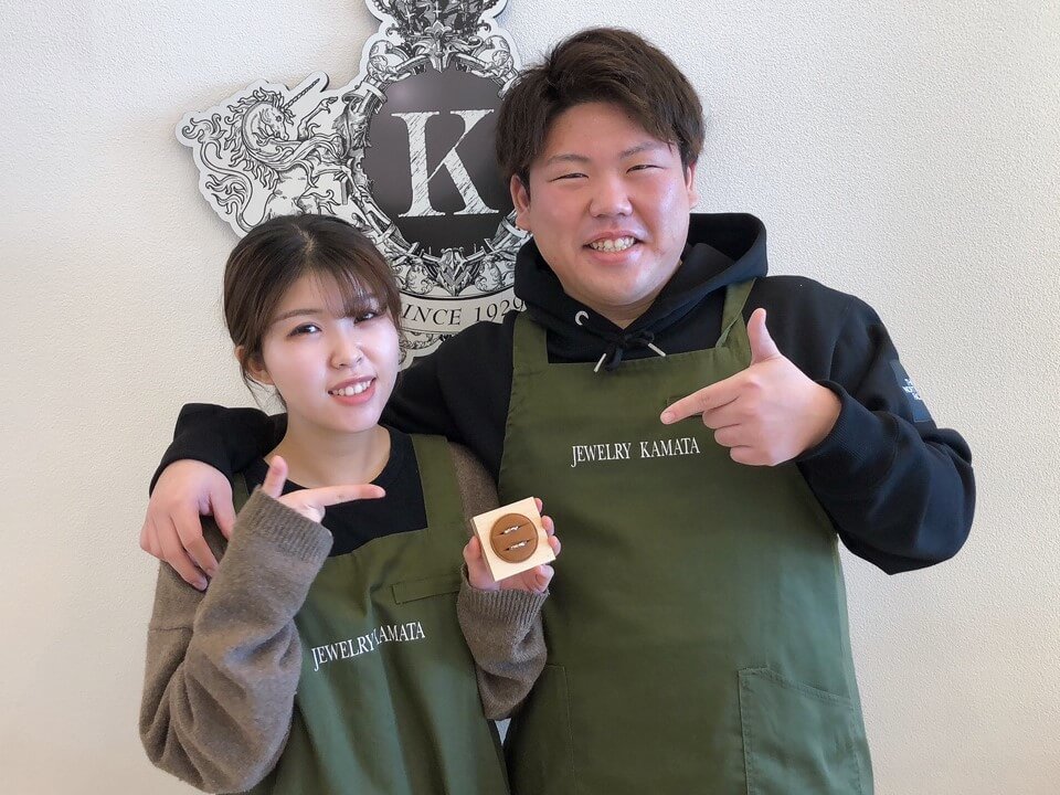 嬉しいです。本当にありがとうございます。私は今妊娠中でお腹が大きいので、手作りの作業が大変な時があるんです。それを気遣って他のスタッフが代わりに担当しますよって言ってくれたんですが、ペアリングとご婚約指輪を担当させていただいたので、どうしてもお二人のリングは私が一緒に作りたくて。
