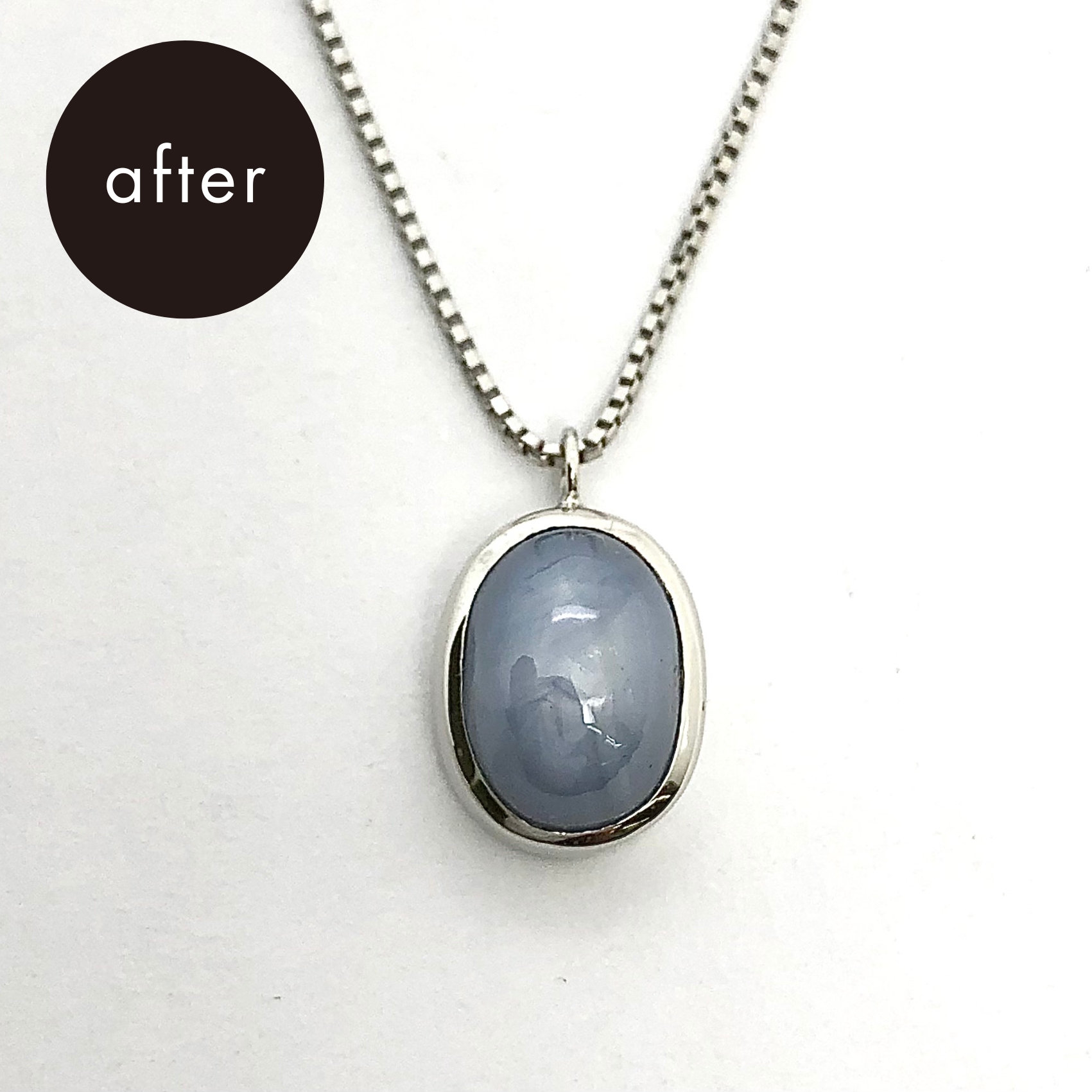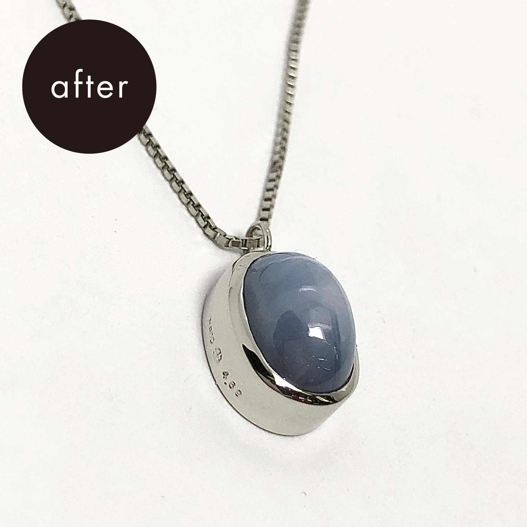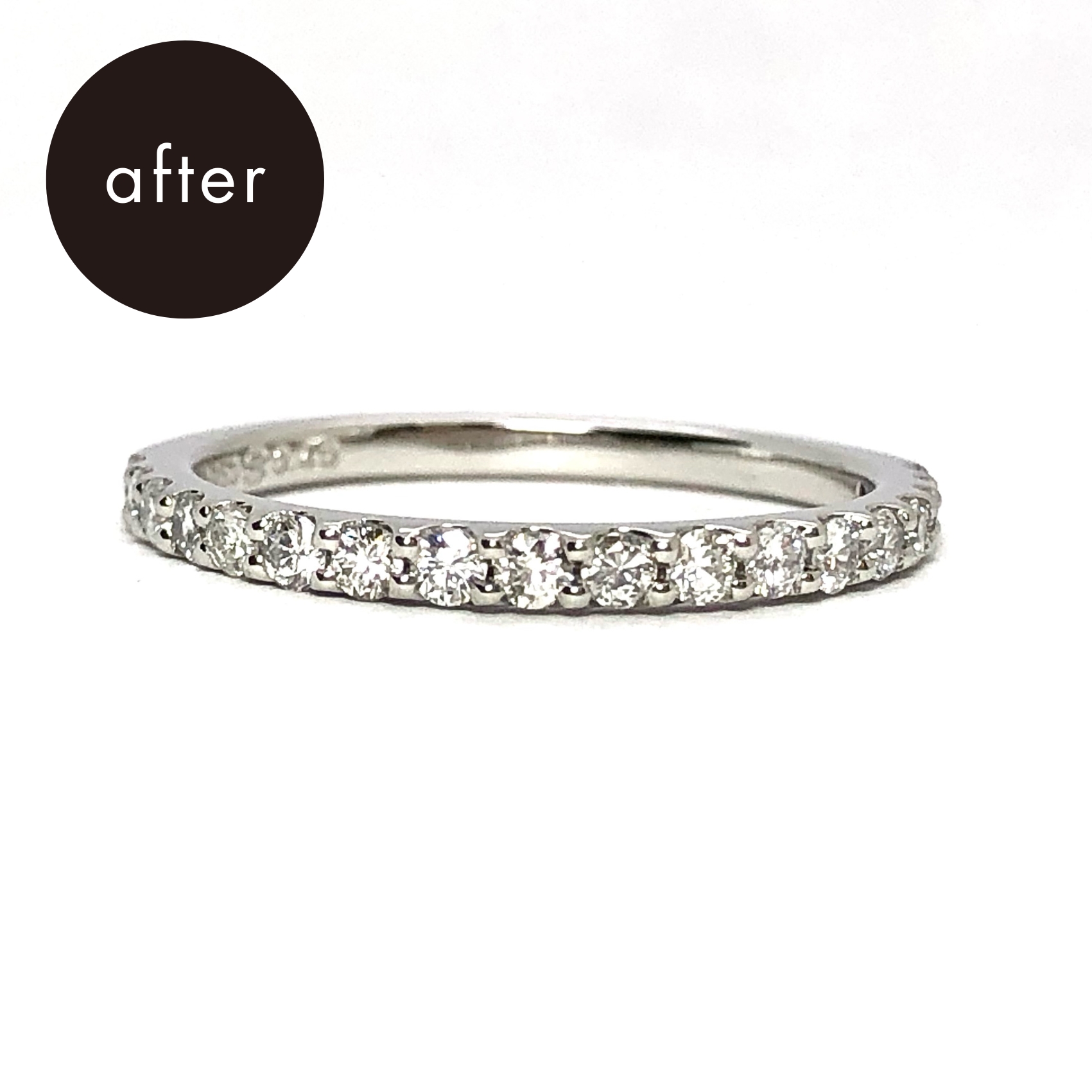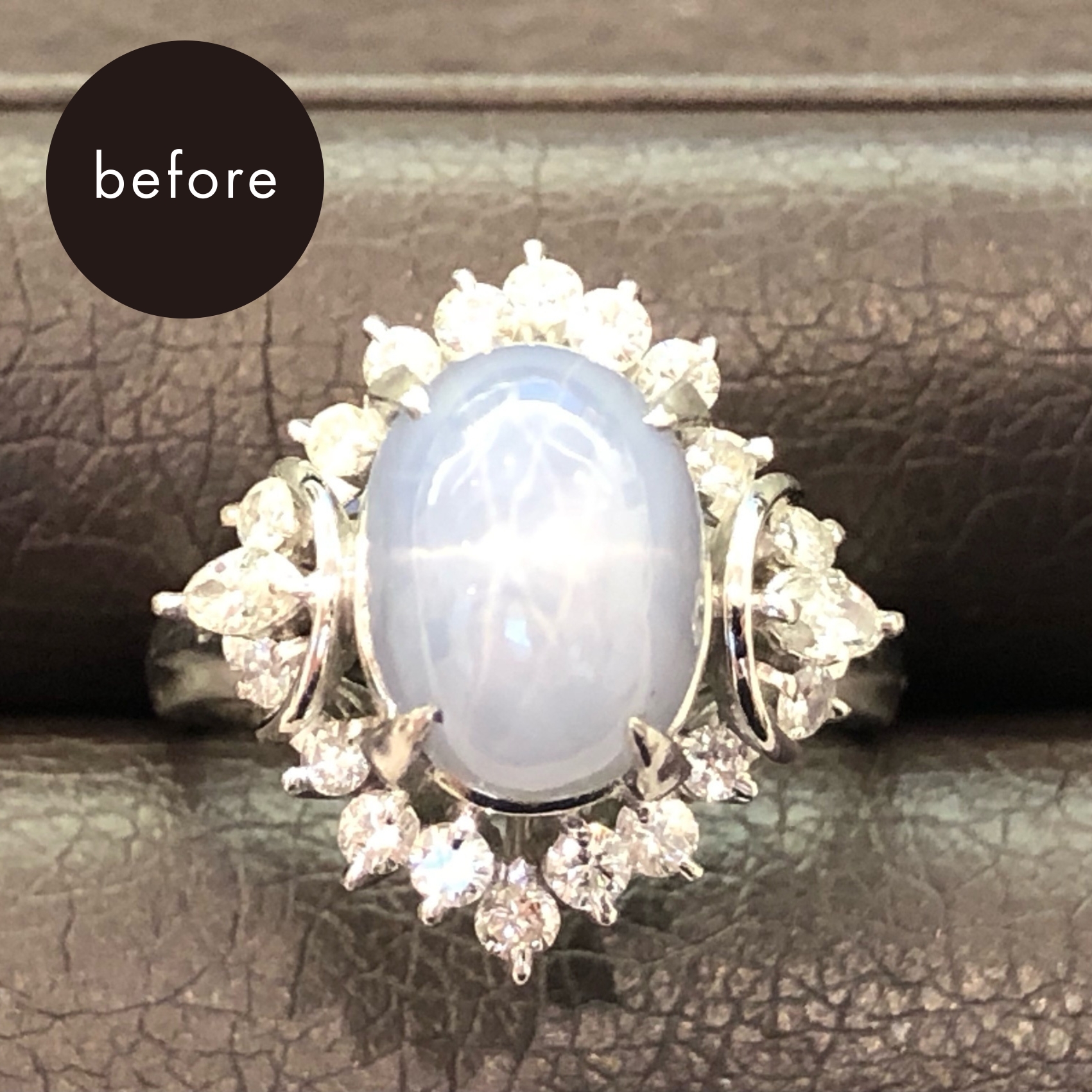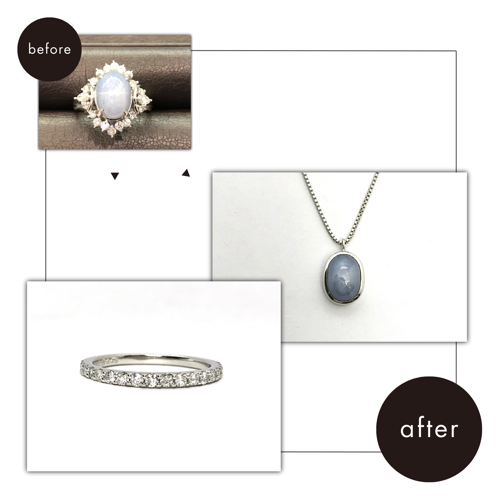 おばあ様の形見のリングを使い、新たにリフォームして身に着けたいとご相談をいただきました。 ボリュームのある水色乳白色石は、大切なパートナーの方とシェアして使えるよう、 男女共に身に着けられるシンプルなネックレスとして生まれ変わりました。 18石の透明石は華やかなハーフエタニティとして生まれ変わり、 ご結婚指輪と重ねて大切に身に着けたいと仰っておりました。 どちらも素敵に生まれ変わり、おばあ様もきっと喜ばれているのではないでしょうか。