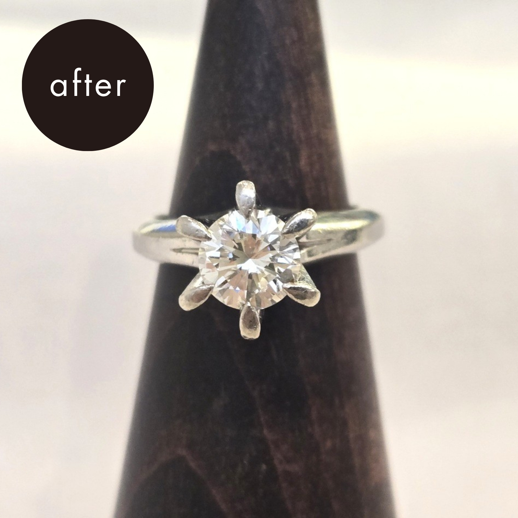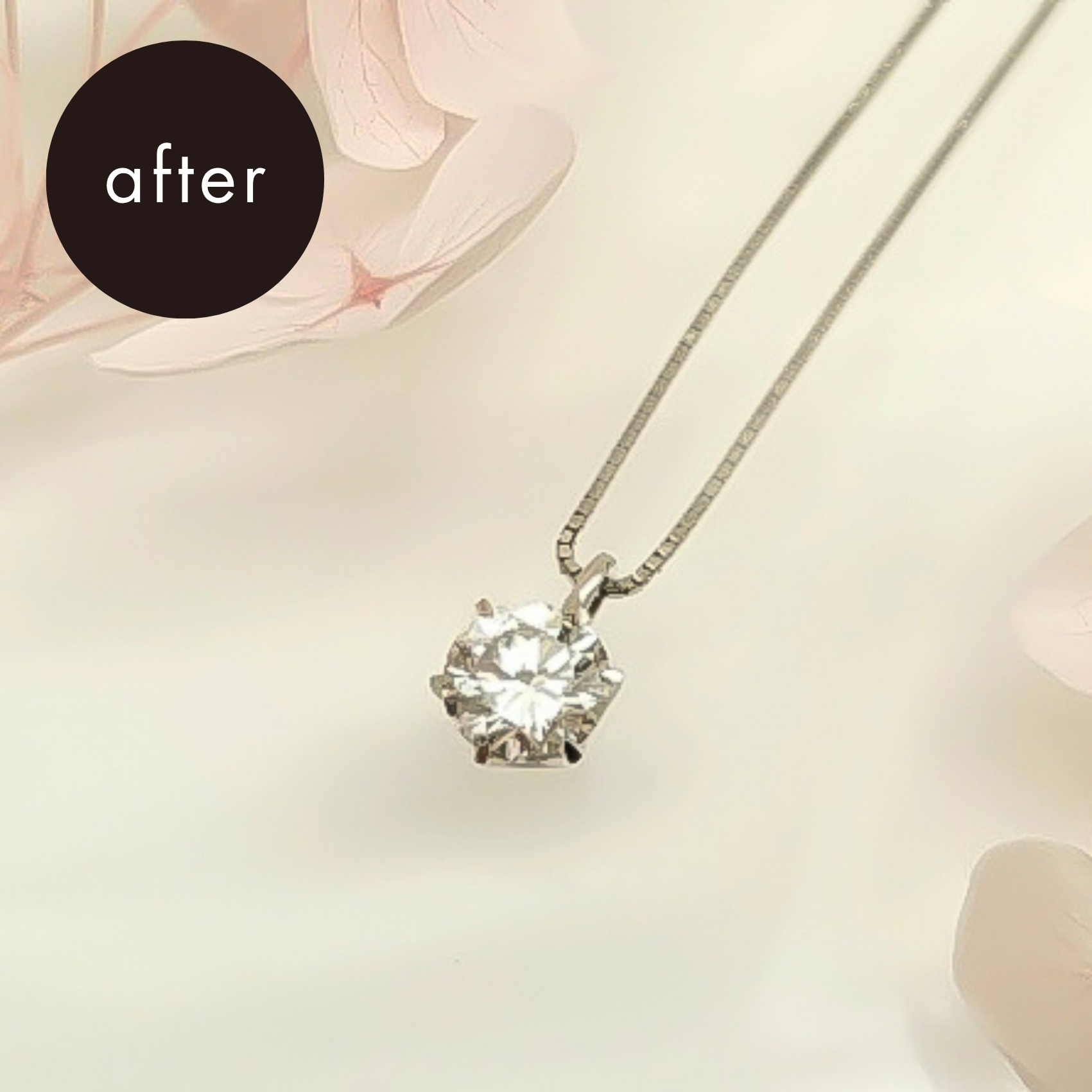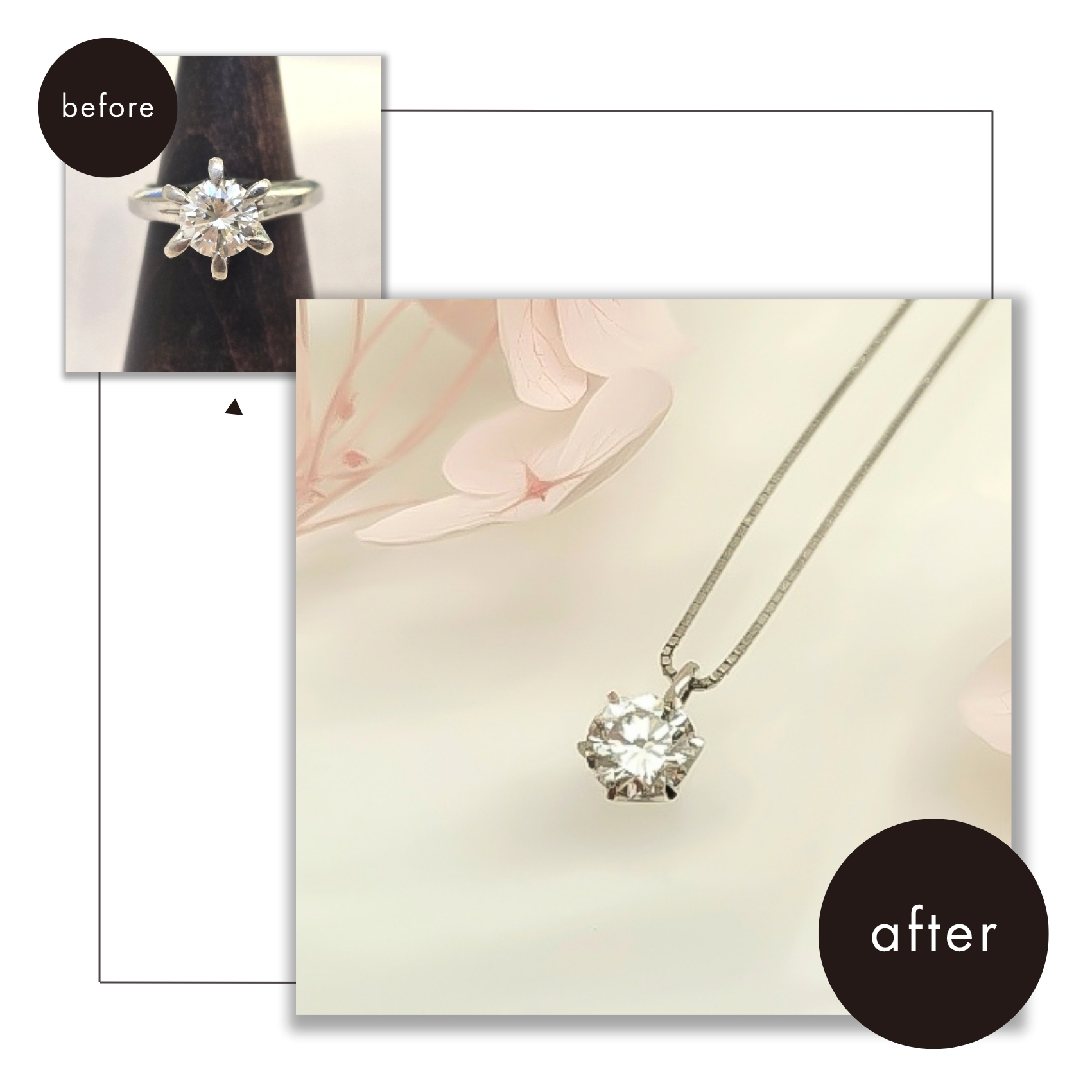 叔母様がファッションリングとして着用していたダイヤリングを譲り受けたそうです。 “思い入れのあるリングだからこそ、普段から身に着けられるようにネックレスにリフォームしたい”とのことで、当店にご来店されました。 1ctのダイヤモンドは、一粒でも目を引く華やかさがありますが、 どんなお洋服でも着用しやすいように、6本爪の台座で支えたシンプルなデザインのネックレスへリフォームしました。