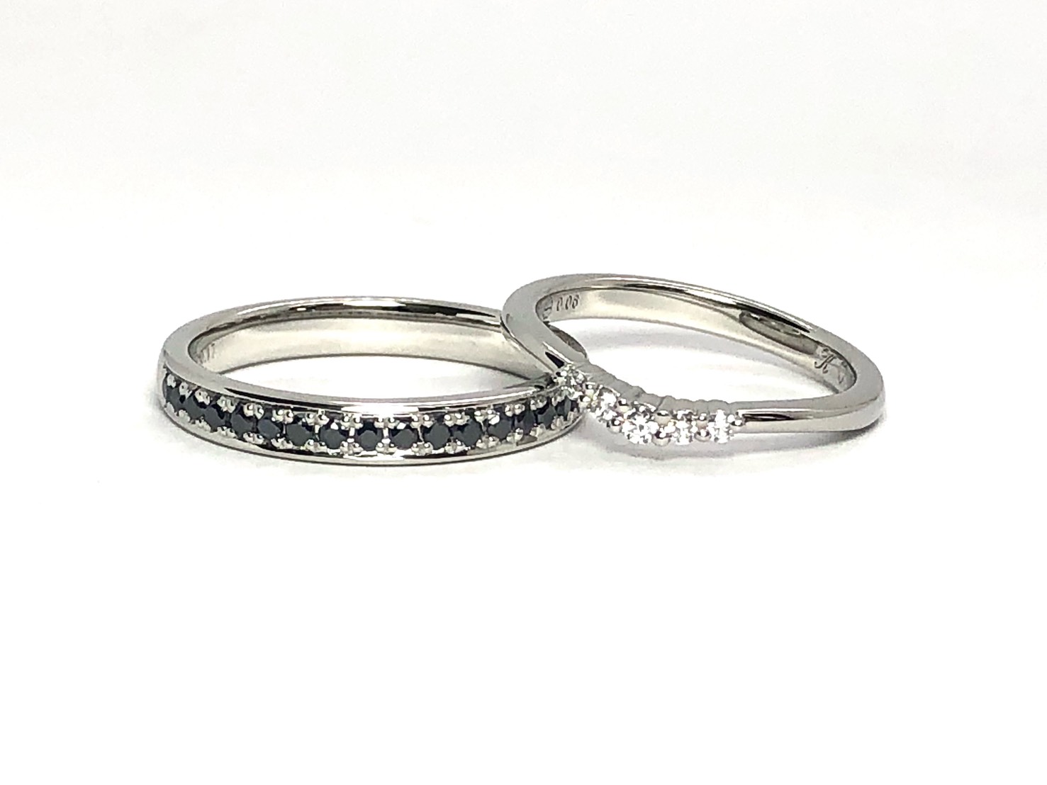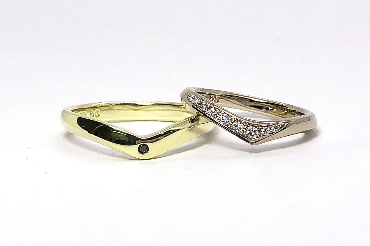 女性用はエンゲージリングに合わせてV字型に、男性用は太めのストレートで、V字型の彫りを入れてあげるなど。形は違ってもペアー感のある、色々なアイデアがございます。まずは、スタッフにご相談くださいませ。