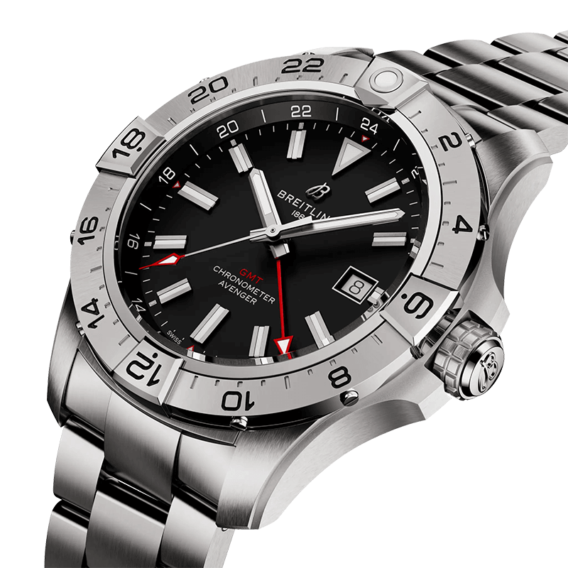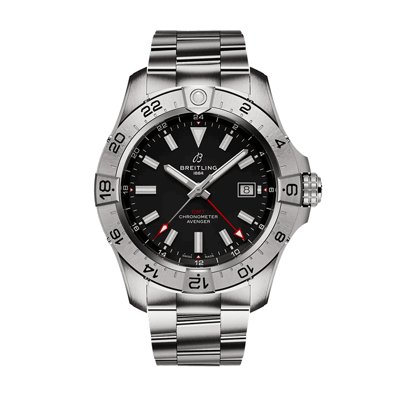 旅が楽しくなる6月。 「ブライトリング アベンジャー オートマチック GMT 44」は、異なるタイムゾーンを一目で確認できる赤いGMT針を備え、