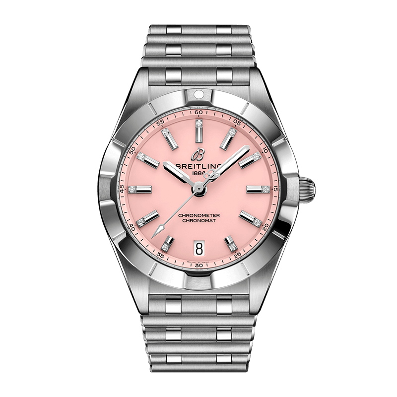 「ブライトリング クロノマット 32」は、洗練されたピンクダイヤルにダイヤモンドが輝き、あなたの手元を上品に彩ります。