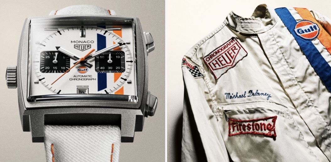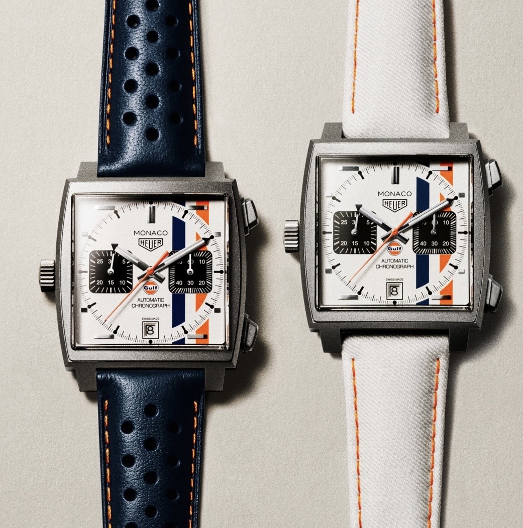 1969年に誕生した角形クロノグラフ「モナコ」の伝統を受け継ぎ、伝説的レーシングチームであるガルフ・レーシングのブルーとオレンジのカラーをダイヤルに採用しています。ホワイトを基調としたダイヤルに、ガルフ・ブルーとオレンジが垂直に駆け抜ける。