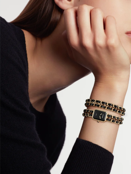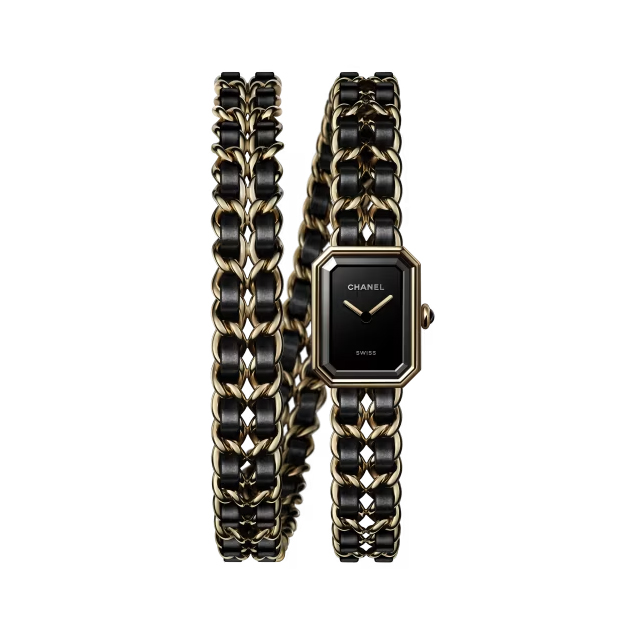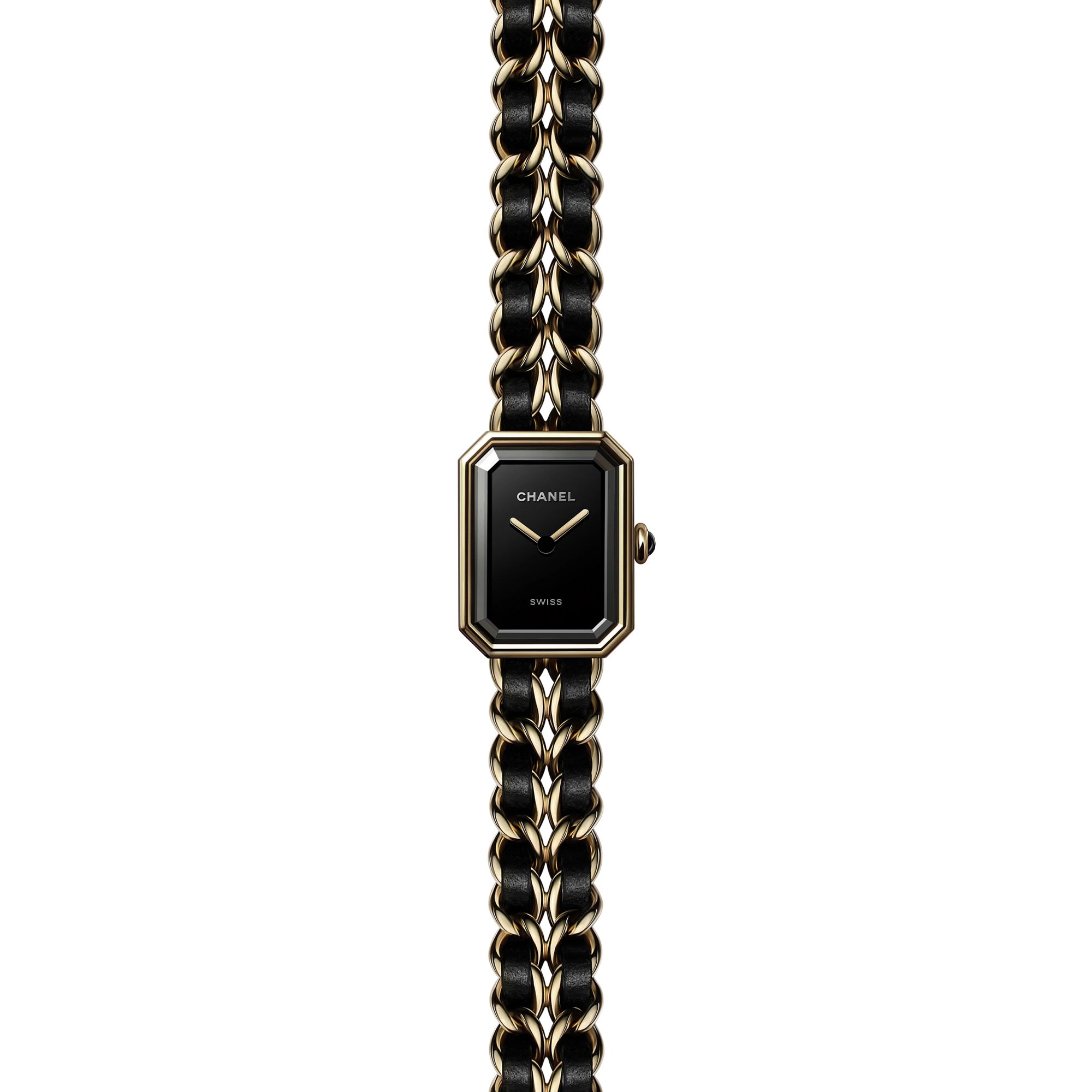 香水「シャネル N°5」のボトルストッパーや、パリのヴァンドーム広場を思わせる八角形のケースに、ブラックレザーを編み込んだゴールドチェーンのブレスレット。