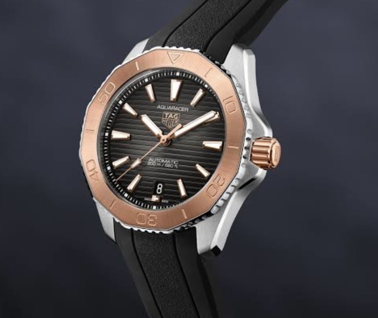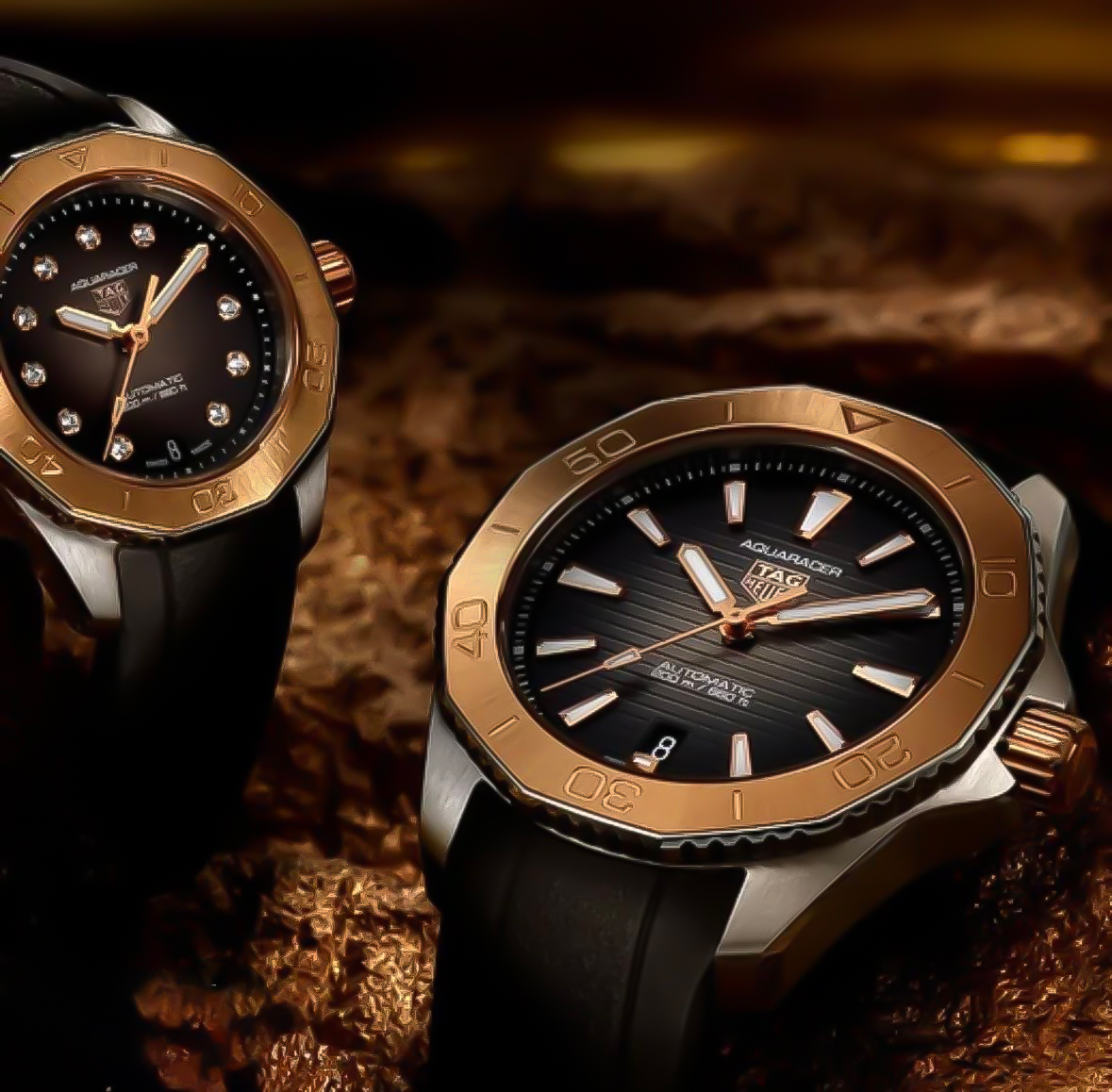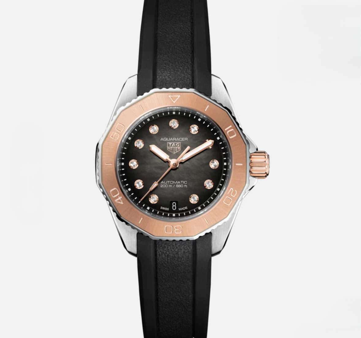 18K5Nソリッドローズゴールドと1.4mm径のVSダイヤモンド(0.107ct)が誇らしく輝く美しいタグ・ホイヤーアクアレーサープロフェッショナル200。そのすべてのディテールにエレガンスが散りばめられています。
